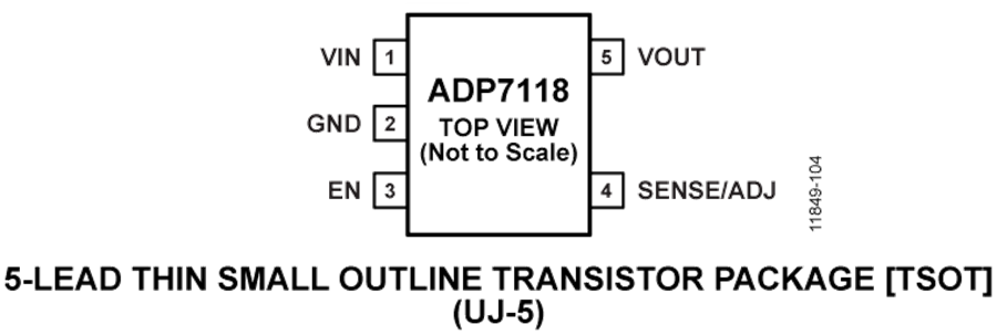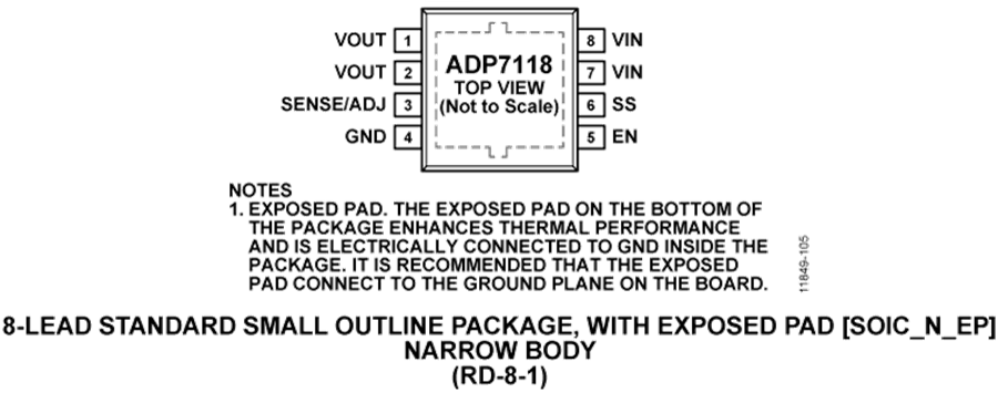 ADP7118提供6引腳、2 mm × 2 mm LFCSP封裝,不僅非常緊湊,而且具有出色的散熱性能,適合要求最大200 mA輸出電流的薄型、小尺寸應用。 ADP7118也提供5引腳TSOT封裝和8引腳SOIC封裝。