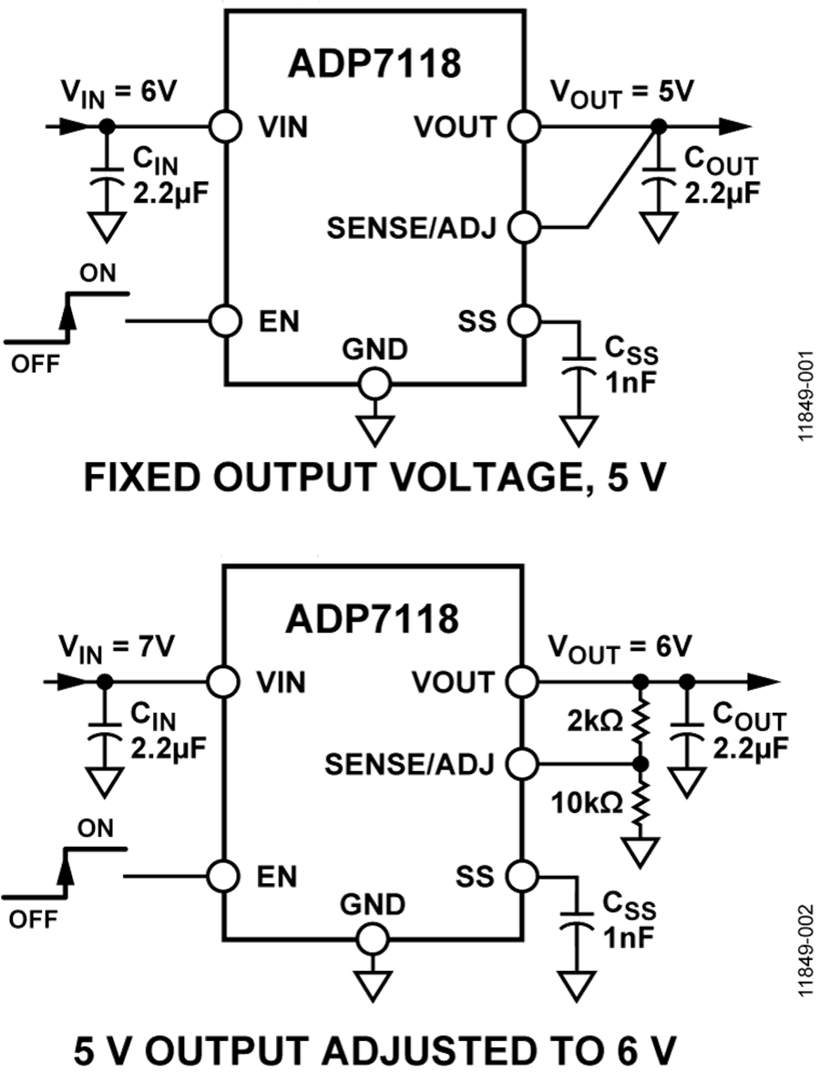 每個固定輸出電壓都可以通過外部反饋分壓器在初始設定點以上調(diào)整。 這使ADP7118可提供1.2 V至VIN–VDO的輸出電壓且具有高PSRR和低噪聲。