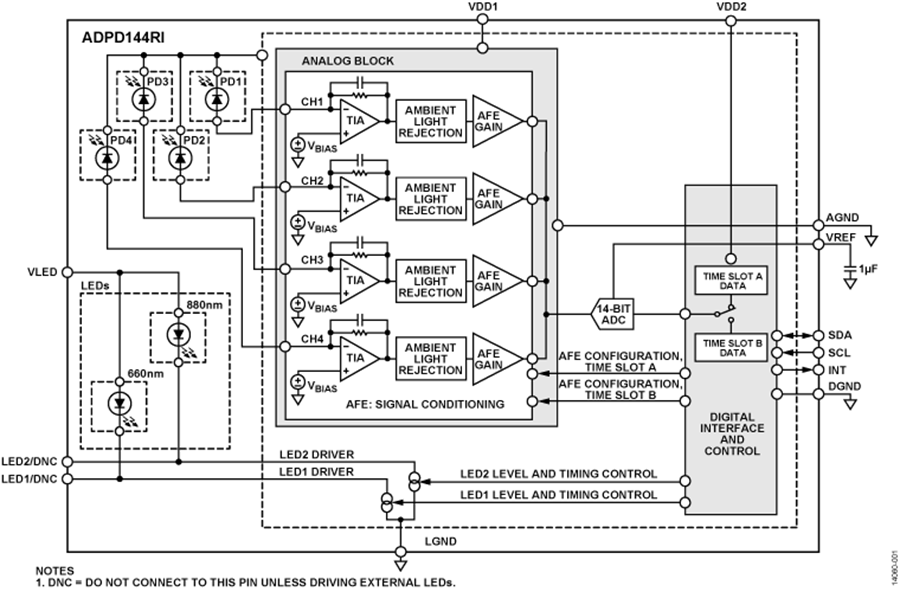 一個(gè)660 nm LED1、一個(gè)880 nm LED2、一個(gè)4通道光電二極管