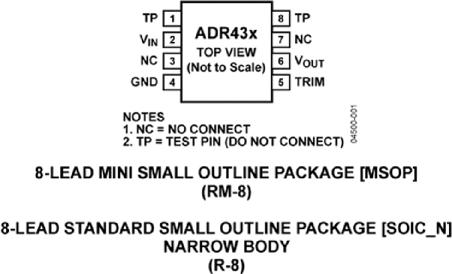 ADR43x提供8引腳MSOP和窄體SOIC兩種封裝。所有型號(hào)產(chǎn)品的額定溫度范圍均為?40°C至+125°C擴(kuò)展工業(yè)溫度范圍。