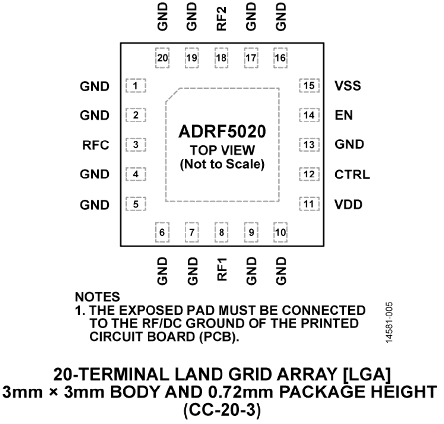 ADRF5020是一款通用型單刀雙擲(SPDT)開關(guān),采用硅工藝制造。它采用3 mm × 3 mm、20引腳基板柵格陣列(LGA)封裝,在100 MHz至30 GHz頻率范圍內(nèi)提供高隔離度和低插入損耗。