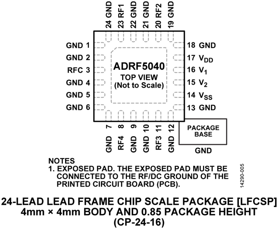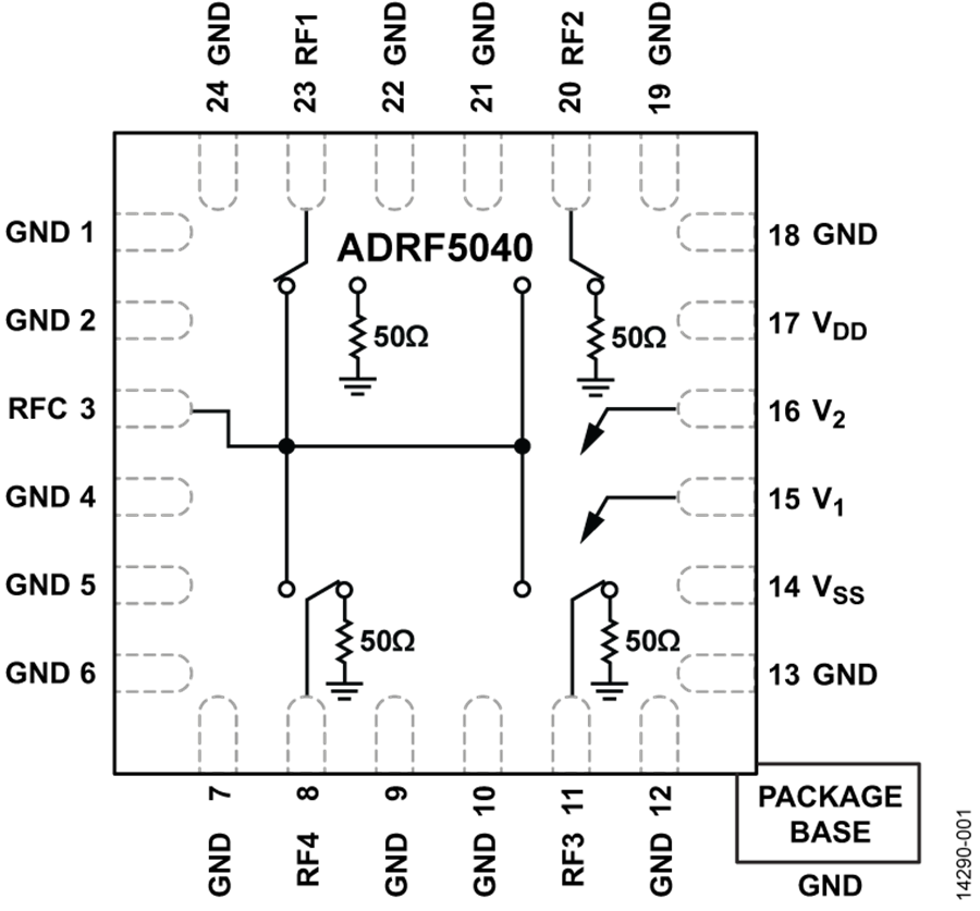 ADRF5040是一款通用、寬帶高隔離度、非反射式單刀四擲(SP4T)開關(guān),采用LFCSP表貼封裝。該開關(guān)頻率范圍為9 kHz至12.0 GHz,具有高隔離度和低插入損耗。該開關(guān)具有34 dB隔離性能,8.0 GHz及以下頻率時的插入損耗為0.8 dB,最終射頻輸出(RFOUT)的0.05 dB裕量的建立時間為9 μs。該開關(guān)采用+3.3和0 V的正控制電壓工作,需要3.3 V和-3.3 V電源供電。該器件采用4 mm × 4 mm表貼LFCSP封裝。