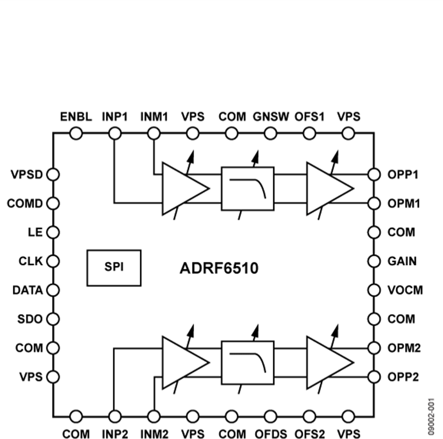 ADRF6510集成一對匹配的完全差分低噪聲、低失真可編程濾波器和可變增益放大器。每個通道都能夠抑制較大的帶外干擾信號,同時忠實放大所需信號,因而模數(shù)轉(zhuǎn)換器的帶寬