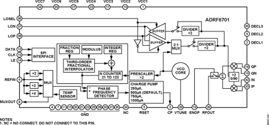 集成小數(shù)N分頻PLL/頻率合成器產(chǎn)生2× fLO輸入,供給IQ調(diào)制器。鑒相器與外部環(huán)路濾波器一起用于控制VCO輸出。VCO輸出施加于正交分頻器。為了減少雜散成分,可編程PLL分頻器由一個(gè)Σ-Δ調(diào)制器進(jìn)行控制。