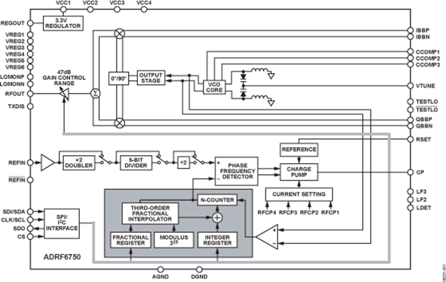 ADRF6750是一款高集成度正交調(diào)制器、頻率合成器和可編程衰減器。該器件工作在950 MHz至1,575 MHz的頻率范圍,適用于衛(wèi)星、蜂窩和寬帶通信。ADRF6750調(diào)制器包括一個集成VCO的高模數(shù)小數(shù)N分頻頻率合成器,其頻率分辨率優(yōu)于1 Hz,以及一個47 dB數(shù)字控制輸出衰減器,步進為1 dB。