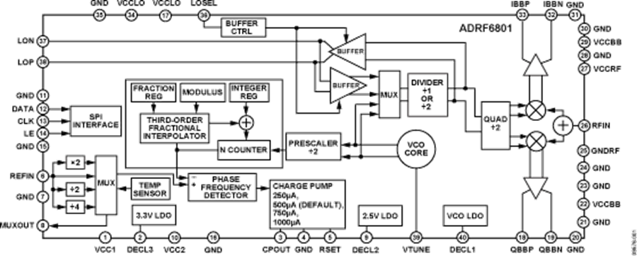 ADRF6801采用先進的硅鍺BiCMOS工藝制造,提供40引腳、裸露焊盤、符合RoHS標(biāo)準(zhǔn)的6 mm x 6 mm LFCSP封裝。額定溫度范圍為?40°C至+85°C。