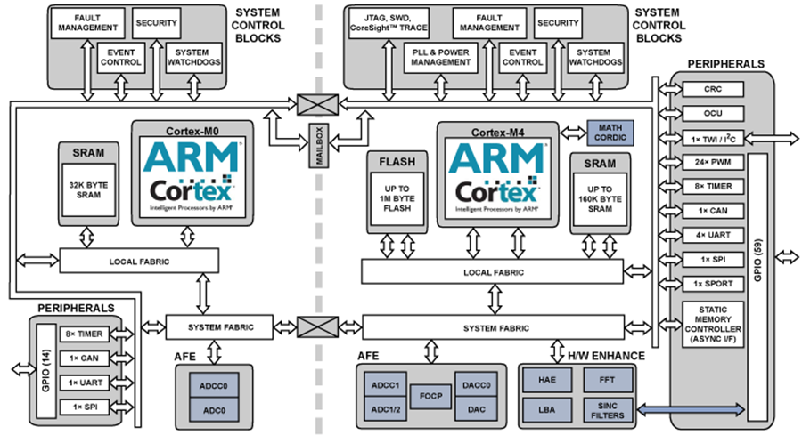 ADSP-CM41xF系列混合信號控制處理器基于ARM? Cortex-M4?處理器內(nèi)核,帶浮點單元,工作頻率高達240 MHz,ARM? Cortex-M0?處理器內(nèi)核工作頻率高達100 MHz。 處理器集成搭載ECC的最高160KB SRAM存儲器、集成ECC的1MB閃存,以及專門針對電機控制和光伏(PV)逆變器控制應用而優(yōu)化的加速器和外設以及由兩個16位SAR型ADC、一個14位M0 ADC和一個12位DAC組成的模擬模塊。 ADSP-CM41xF系列采用單電源供電,用內(nèi)部穩(wěn)壓器和一個外部調(diào)整管自行生成內(nèi)部電壓源。 ADSP-CM41xF混合信號控制處理器集成了許多業(yè)界領先的系統(tǒng)外設和豐富的存儲器,在一個集成封裝中提供RISC式編程能力和先進的信號處理能力,堪稱新一代應用的首選平臺。 這些應用涵蓋眾多功率轉(zhuǎn)換市場領域,包括太陽能PV逆變器、電機/功率控制和電池充電/控制應用。