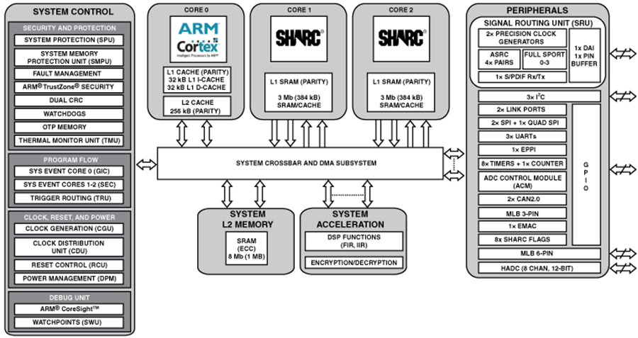 單芯片SOC針對(duì)BOM成本和電路板面積而優(yōu)化 ?集成雙通道SHARC+浮點(diǎn)DSP內(nèi)核和ARM? Cortex?-A5處理器