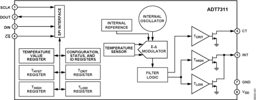 ADT7311是一款窄體8引腳SOIC封裝高精度數(shù)字溫度傳感器。它內(nèi)置一個(gè)帶隙溫度基準(zhǔn)源和一個(gè)16位ADC,用來(lái)監(jiān)控溫度并進(jìn)行數(shù)字轉(zhuǎn)換,分辨率為0.0078°C。默認(rèn)ADC分辨率設(shè)置為13位(0.0625°C)。ADC分辨率為用戶可編程模式,可通過(guò)串行接口更改。