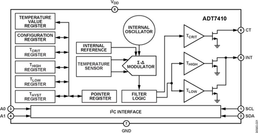 引腳A0和引腳A1可用于地址選擇,使ADT7410具有四個(gè)可能的I2C? ?地址。CT引腳屬于開漏輸出,當(dāng)溫度超過臨界溫度限值(可編程)時(shí),該引腳變?yōu)橛行?。默認(rèn)臨界溫度限值為147°C。INT引腳也屬于開漏輸出,當(dāng)溫度超過限值(可編程)時(shí),該引腳變?yōu)橛行?。INT和CT引腳能夠以比較器模式或中斷模式工作。