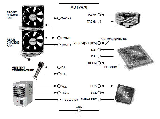 The ADT7476 controller is a thermal monitor and multiple PWM fan controller for noise-sensitive or powersensitive applications requiring active system cooling. The ADT7476 can drive a fan using either a low or high frequency drive signal, monitor the temperature of up to two remote sensor diodes plus its own internal temperature, and measure and control the speed of up to four fans so they operate at the lowest possible speed for minimum acoustic noise.