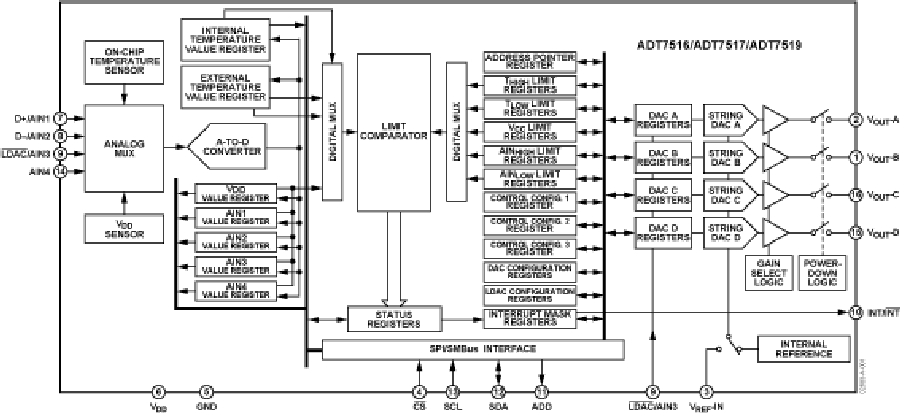 ADT7516/ADT7517/ADT7519 在一個(gè)16引腳QSOP封裝中集成了一個(gè)10位溫度數(shù)字轉(zhuǎn)換器、一個(gè)10位4通道ADC和一個(gè)4通道12/10/8位DAC。這些器件還內(nèi)置一個(gè)帶隙溫度傳感器和一個(gè)10位ADC,用來以0.25°C的分辨率對(duì)溫度進(jìn)行監(jiān)控和數(shù)字化。ADT7516/ADT7517/ADT7519采用2.7 V至5.5 V單電源供電。 ADC通道的輸入電壓范圍為0 V至2.28 V,輸入帶寬為DC。ADC通道的基準(zhǔn)電壓從內(nèi)部獲得。DAC的輸出電壓范圍為0 V至 VDD ,輸出電壓的建立時(shí)間典型值為7 μs。