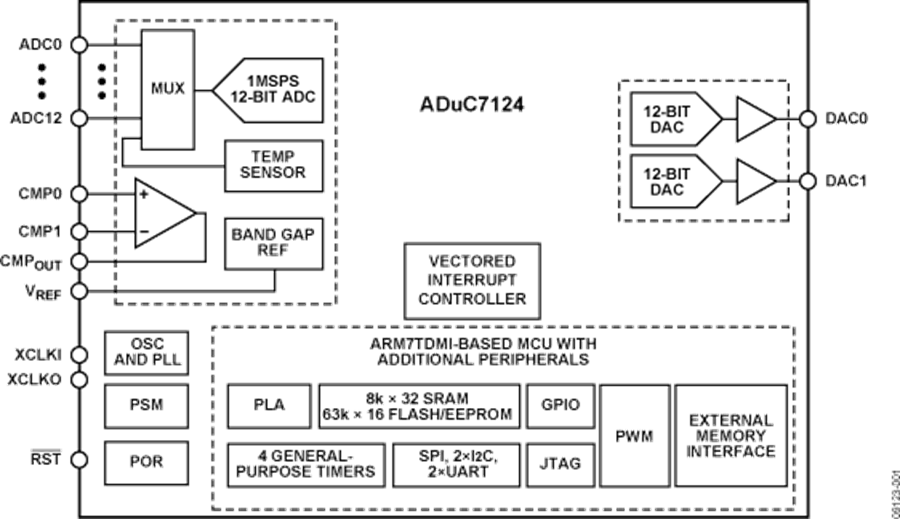ADuC7124是一款完全集成的1 MSPS、12位數(shù)據(jù)采集系統(tǒng),在單芯片內(nèi)集成高性能多通道ADC、16位/32位MCU和Flash/EE存儲(chǔ)器。ADC具有多達(dá)12路單端輸入。另外還有2路輸入,但它們與2個(gè)DAC輸出引腳復(fù)用。ADC可以在單端或差分輸入模式工作。ADC輸入電壓范圍為0 V至VREF。低漂移帶隙基準(zhǔn)電壓源、溫度傳感器和電壓比較器完善了ADC的外設(shè)設(shè)置。