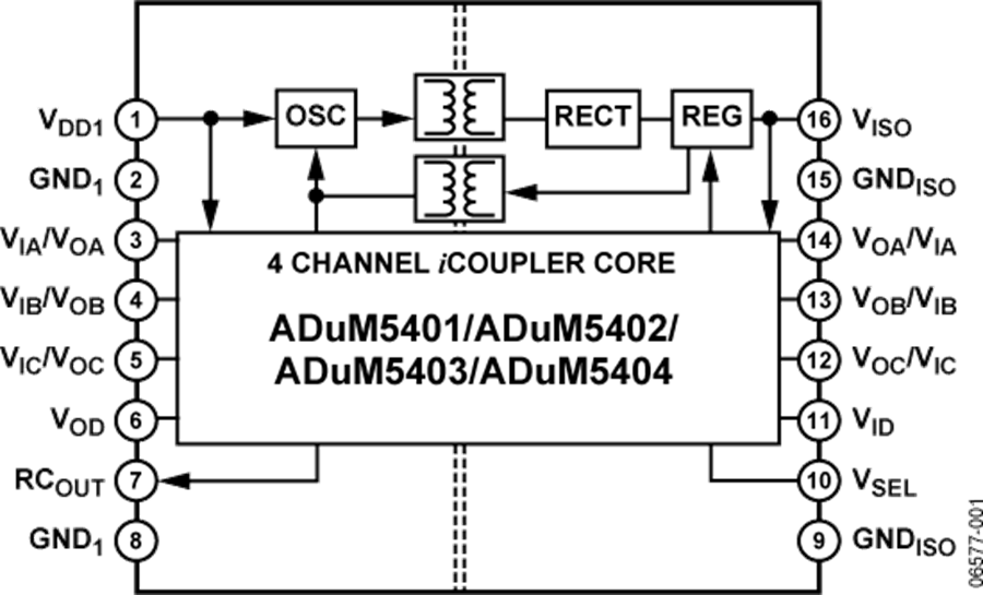 ADuM5401/ADuM5402/ADuM5403/ADuM5404 均為四通道數(shù)字隔離器,集成isoPower?隔離式DC/DC轉(zhuǎn)換器。該DC-DC轉(zhuǎn)換器基于ADI公司的iCoupler?技術(shù),采用5.0 V(5.0V輸入電源)或3.3 V電壓(3.3V電源)時(shí),可提供高達(dá)500 mW的穩(wěn)壓隔離功率。在低功耗隔離設(shè)計(jì)中,無需使用單獨(dú)的隔離式DC-DC轉(zhuǎn)換器。利用iCoupler芯片級變壓器技術(shù),能夠同時(shí)隔離邏輯信號和DC/DC轉(zhuǎn)換器的磁性元件,因此可提供小尺寸、完全隔離的解決方案。ADuM5401/ADuM5402/ADuM5403/ADuM5404隔離器提供4個(gè)獨(dú)立的隔離通道,支持多種通道配置和數(shù)據(jù)速率(更多信息請參考“訂購指南”)。