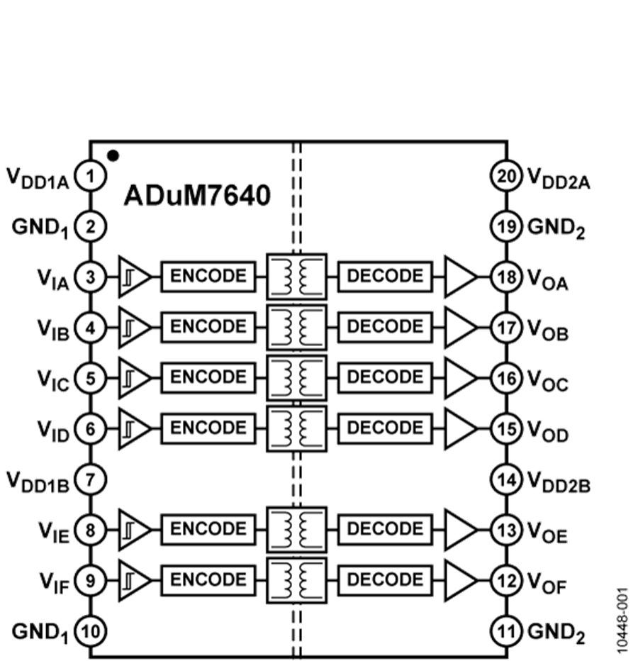 ADuM7640/ADuM7641/ADuM7642/ADuM7643是采用ADI公司iCoupler?技術的6通道數(shù)字隔離器。這些1kV數(shù)字隔離器件采用小型20引腳QSOP封裝。在僅需功能隔離時,與2.5kV或5kV隔離解決方案相比,這些器件可節(jié)約空間且成本更低。像ADI公司的許多隔離器一樣,該產品系列采用3.0V至5.5V的電源電壓,并且功耗極低,僅為其它數(shù)字隔離器的十分之一至六分之一。除此之外,DuM7640/ADuM7641/ADuM7642/ADuM7643還提供低脈沖寬度失真(C級小于6 ns)和逐通道毛刺濾波器以保護設備不受外來噪聲干擾。四種通道方向組合提供1Mbps或25Mbps的最高數(shù)據(jù)速率。在沒有輸入電源的情況下,所有型號的缺省輸出均為邏輯高電平狀態(tài)。
