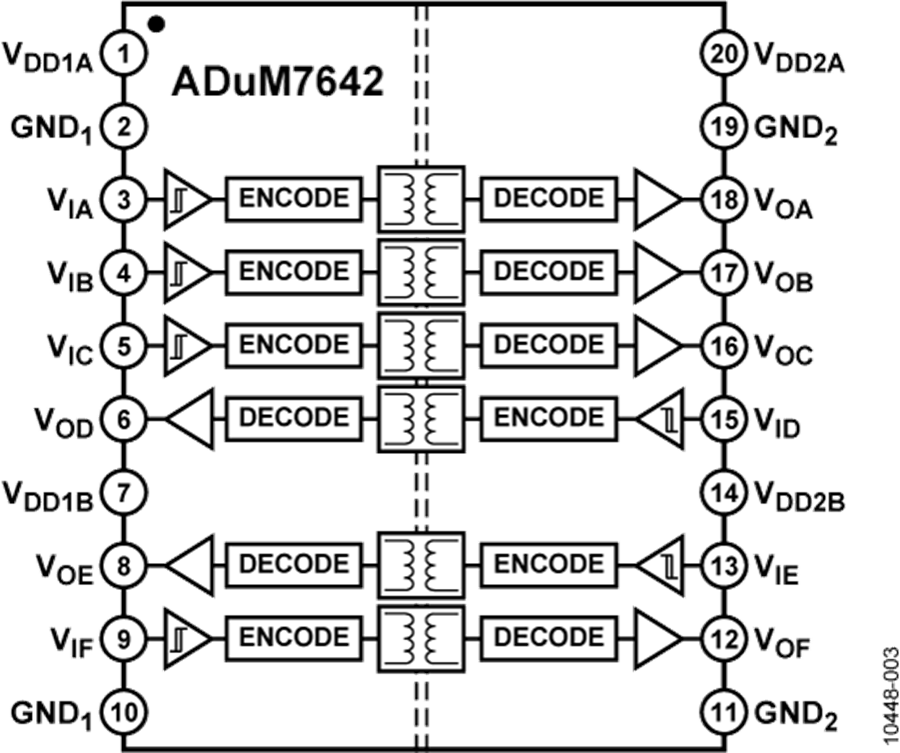 ADuM7640/ADuM7641/ADuM7642/ADuM7643 是采用ADI公司iCoupler?技術的6通道數字隔離器。這些1kV數字隔離器件采用小型20引腳QSOP封裝。在僅需功能隔離時,與2.5kV或5kV隔離解決方案相比,這些器件可節(jié)約空間且成本更低。像ADI公司的許多隔離器一樣,該產品系列采用3.0V至5.5V的電源電壓,并且功耗極低,僅為其它數字隔離器的十分之一至六分之一。除此之外,DuM7640/ADuM7641/ADuM7642/ADuM7643還提供低脈沖寬度失真(C級小于6 ns)和逐通道毛刺濾波器以保護設備不受外來噪聲干擾。四種通道方向組合提供1Mbps或25Mbps的最高數據速率。在沒有輸入電源的情況下,所有型號的缺省輸出均為邏輯高電平狀態(tài)。