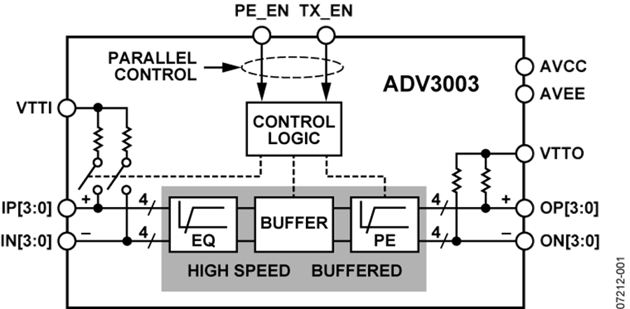 外部控制引腳TX_EN可同時禁用發(fā)射器和片內輸入端接電阻。此特性可降低ADV3003的功耗,并在ADV3003禁用時告知相連的器件源。