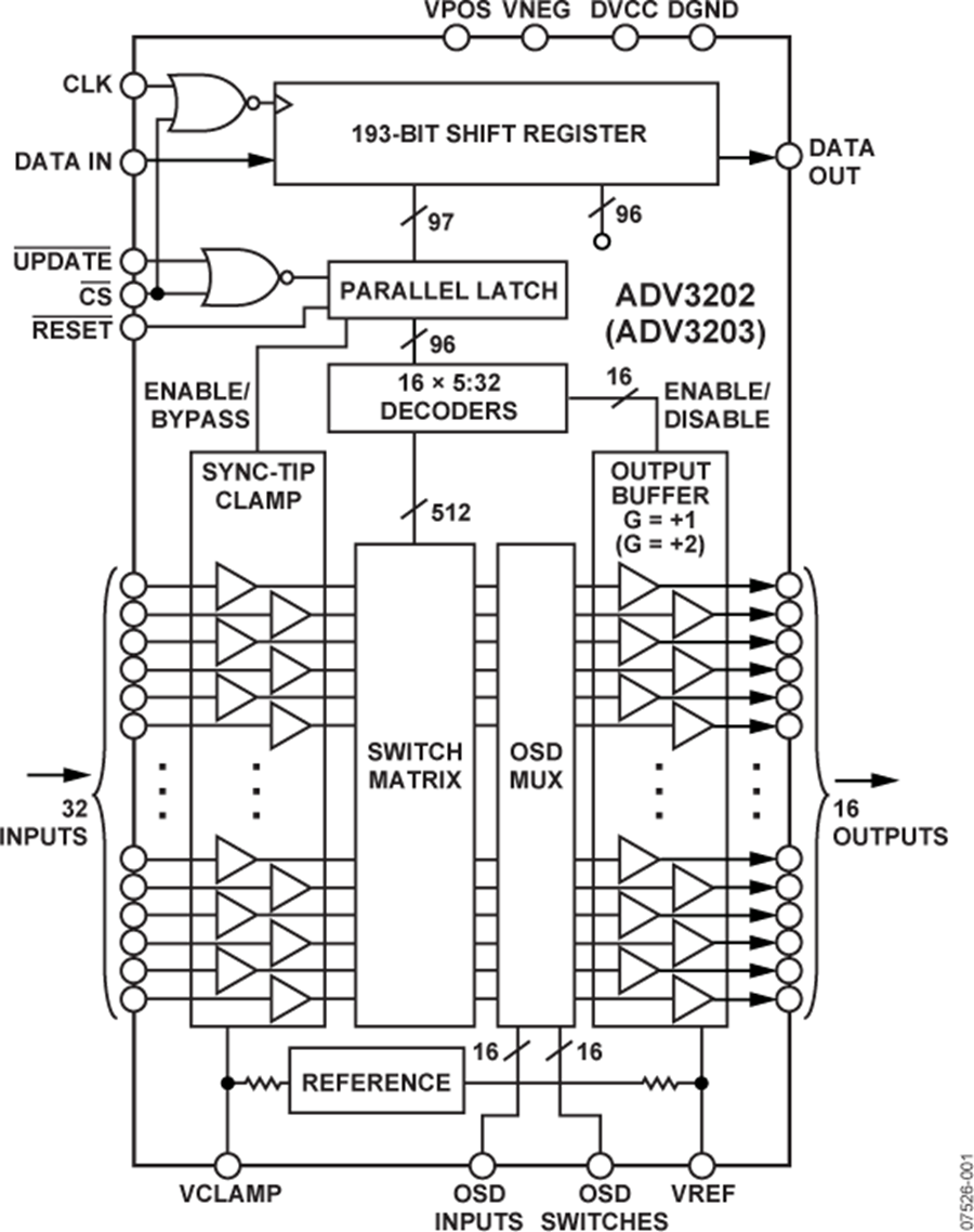 ADV3202/ADV3203為32 × 16模擬交叉點(diǎn)開關(guān)矩陣,具有適合交流耦合應(yīng)用的可選同步脈沖頂部箝位輸入,以及一個(gè)2:1屏幕顯示(OSD)插入多路復(fù)用器。兩款器件的串?dāng)_性能均為?48 dB,隔離性能為?80 dB (5 MHz),因而適合許多高密度路由應(yīng)用。同時(shí)0.1 dB平坦度達(dá)60 MHz,堪稱復(fù)合視頻和分量視頻切換應(yīng)用的理想之選。ADV3202/ADV3203內(nèi)置16個(gè)獨(dú)立輸出緩沖器,可以將這些緩沖器置于高阻抗?fàn)顟B(tài),以提供并行交叉點(diǎn)輸出,因此構(gòu)建更大陣列時(shí),關(guān)斷通道僅向輸出總線提供極小的負(fù)載。ADV3202具有增益+1,而ADV3203則具有增益+2,適合后部端接負(fù)載應(yīng)用。兩款器件可以采用+5 V單電源、±2.5 V雙電源或±3.3 V雙電源供電,所有輸出均使能時(shí)的空閑功耗僅為195 mA。通道切換通過雙緩沖式串行數(shù)字控制接口實(shí)現(xiàn),可以利用該接口將多個(gè)器件以菊花鏈形式連接起來。