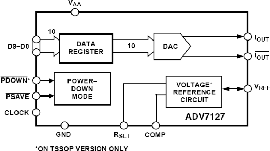 ADV7127 (ADV?)是一款單芯片、高速數(shù)模轉(zhuǎn)換器,內(nèi)置一個(gè)10位、帶片內(nèi)基準(zhǔn)電壓源、互補(bǔ)輸出的視頻數(shù)模轉(zhuǎn)換器、一個(gè)標(biāo)準(zhǔn)TTL輸入接口以及高阻抗、模擬輸出電流源。它有一個(gè)10位寬輸入端口。只需一個(gè)+5 V/+3.3 V單電源和時(shí)鐘便能工作。ADV7127采用CMOS工藝制造,單芯片CMOS結(jié)構(gòu)可確保以更低功耗提供更多功能。它采用28引腳小形集成SOIC封裝或24引腳TSSOP封裝。