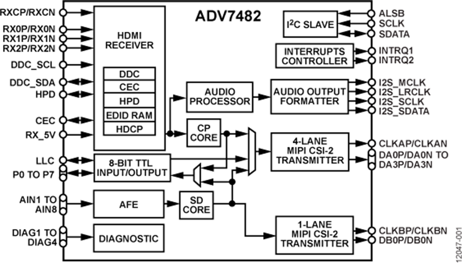 ADV7482具有一個(gè)靈活的音頻輸出端口,用于輸出從HDMI流提取的音頻數(shù)據(jù)。 HDMI接收器具有高級(jí)音頻功能,其中包括靜音控制器,用于消除音頻輸出中的外來聲頻噪聲。 此外,可以將ADV7482設(shè)置為輸出時(shí)分多路復(fù)用(TDM)串行音頻,支持通過單個(gè)音頻輸出接口端口傳輸八個(gè)多路復(fù)用串行音頻通道。