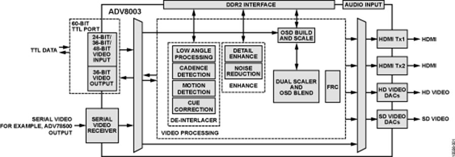 ADV8003是一款多輸入視頻信號(hào)處理器,可對(duì)標(biāo)清、增清或高清視頻數(shù)據(jù)進(jìn)行去隔行處理并將其調(diào)節(jié)為高清格式,能夠生成屏幕顯示位圖(OSD),且以O(shè)SD重疊的形式利用兩個(gè)高清多媒體接口(HDMI)發(fā)送器及一個(gè)視頻編碼器輸出視頻。可通過(guò)多種方式將視頻輸入ADV8003:使用48位TTL像素端口、使用24位外部OSD TTL像素端口或者帶有HDMI發(fā)送器的器件(例如ADV7850)。ADV8003支持CEA-861和VESA規(guī)范中的許多格式,以及其他一些廣泛運(yùn)用的時(shí)序格式。