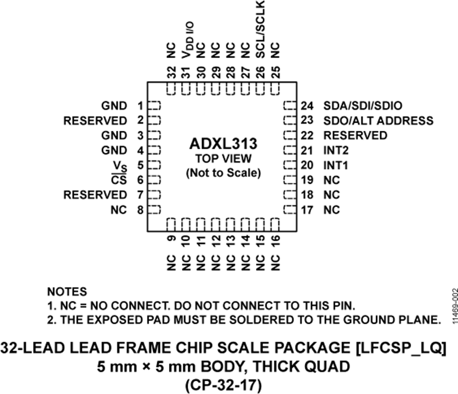 ADXL313采用5 mm × 5 mm × 1.45 mm、32引腳小型超薄LFCSP封裝,與ADXL312加速度計引腳兼容。
