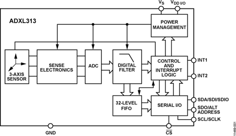 ADXL313是一款小而薄的低功耗3軸加速度計,分辨率高(13位),測量范圍達(dá)±4 g。數(shù)字輸出數(shù)據(jù)為16位二進(jìn)制補(bǔ)碼格式,可通過串行端口接口(SPI)(3線式或4線式)或I2C數(shù)字接口訪問。ADXL313非常適合汽車報警或黑匣子應(yīng)用。它可以在傾斜檢測應(yīng)用中測量靜態(tài)重力加速度,還可以測量運(yùn)動或沖擊導(dǎo)致的動態(tài)加速度。該器件具有高分辨率(1024 LSB/g)和低噪聲(150 μg/√Hz)性能,能夠分辨小到0.1°的傾角變化。內(nèi)置FIFO有利于使用過采樣技術(shù),將傾角分辨率提升至0.025°。