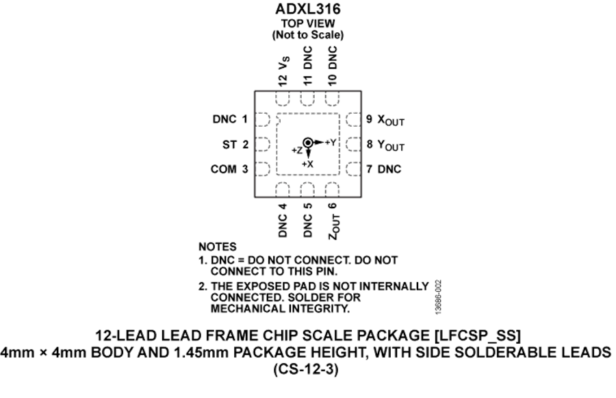 ADXL316提供小尺寸、薄型、12引腳、4 mm × 4 mm × 1.45 mm塑料引腳架構(gòu)芯片級(jí)封裝(LFCSP_LQ)。