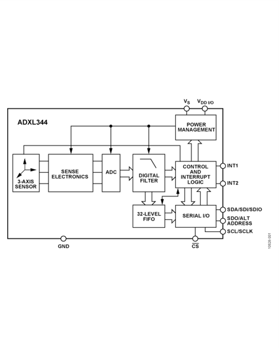 The ADXL344 is a versatile 3-axis, digital-output, low g MEMS accelerometer. Selectable measurement range and bandwidth and configurable, built-in motion detection make it suitable for sensing acceleration in a wide variety of applications. Robustness to 10,000 g/of shock and a wide temperature range (?40°C to +85°C) enable use of the accelerometer even in harsh environments.The ADXL344 measures acceleration with high resolution (13-bit) measurement at up to ±16 g/. Digital output data is formatted as 16-bit twos complement and is accessible through either a SPI (3- or 4-wire) or I2C digital interface. The ADXL344 can measure the static acceleration of gravity in tilt-sensing appli-cations, as well as dynamic acceleration resulting from motion or shock. Its high resolution (3.9 mg/LSB) enables measurement of inclination changes less than 1.0°.