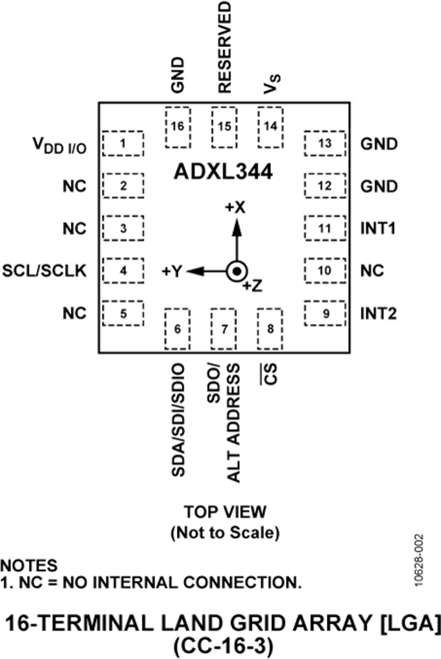 The ADXL344 is supplied in a small, thin, 3 mm × 3 mm × 0.95 mm, 16-terminal, plastic package.