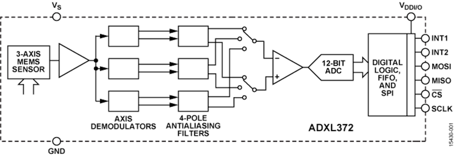 ADXL372是一款超低功耗、3軸、±200 g MEMS加速度計(jì),以3200 Hz輸出數(shù)據(jù)速率(ODR)工作時(shí)功耗為22 μA。ADXL372未對(duì)其前端周期供電以實(shí)現(xiàn)其低功耗操作,因此不會(huì)冒傳感器輸出混疊的風(fēng)險(xiǎn)。
