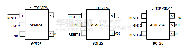 復位輸出低電平有效( APX823 / APX824 / APX825A )提供,高電平有效(APX824 / APX825A )
