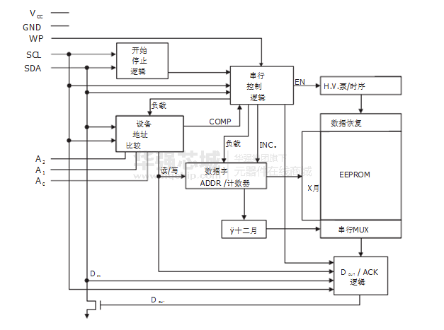AT24C01/02/04/08/16...是一個1K/2K/4K/8K/16K位電可擦除PROM,內部含有128/256/512/1024/2048個8位字節(jié),AT24C01有一個8字節(jié)頁寫緩沖器,AT24C02/04/08/16有一個16字節(jié)頁寫緩沖器。