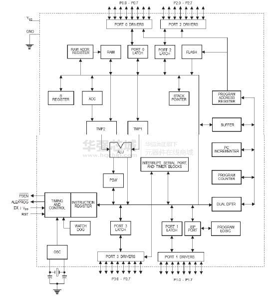 2個(gè)數(shù)據(jù)指針,三個(gè)16位定時(shí)器/計(jì)數(shù)器,一個(gè)6向量2級(jí)中斷結(jié)構(gòu),一個(gè)全雙工串行口,片上振蕩器,和時(shí)鐘電路。此外,