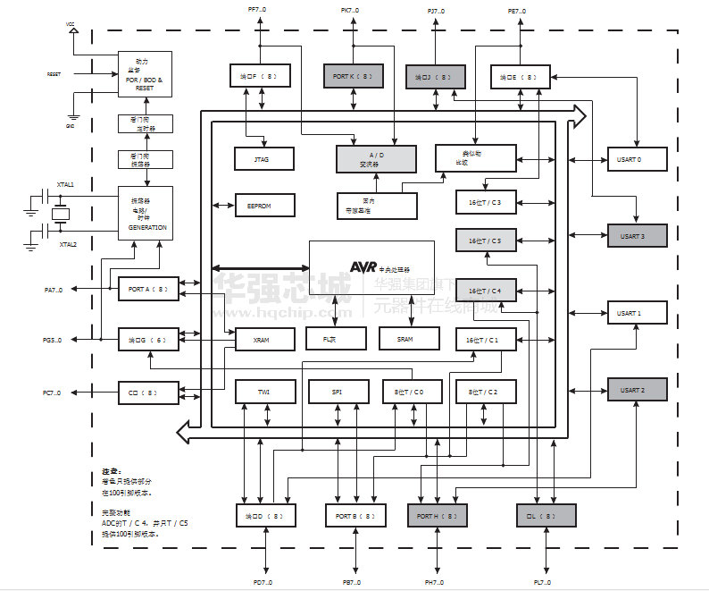 - 六個睡眠模式:空閑模式, ADC噪聲抑制,省電,掉電,待機,