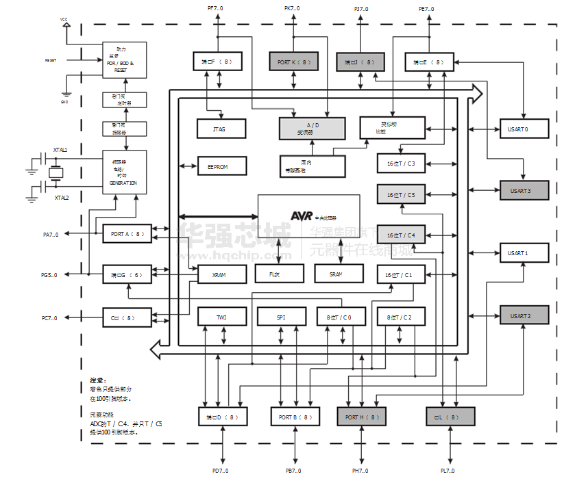 - 六個睡眠模式:空閑模式, ADC噪聲抑制,省電,掉電,待機(jī),