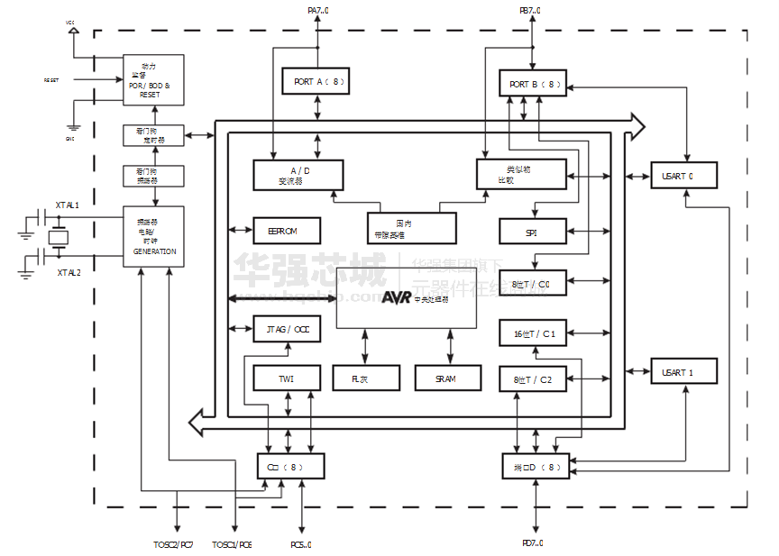- 六個(gè)睡眠模式:空閑模式, ADC噪聲抑制,省電,掉電,待機(jī)和
