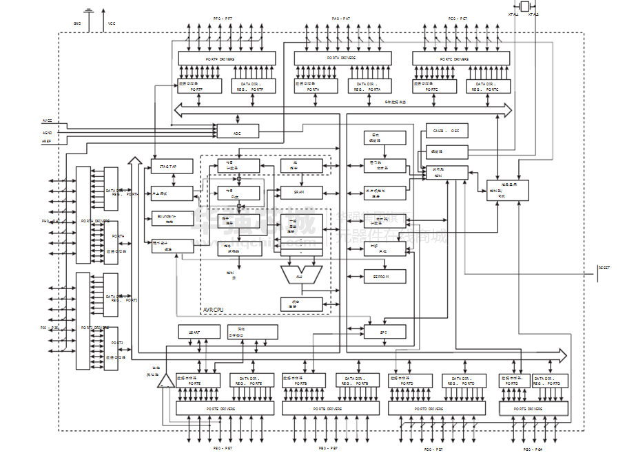 - 五種睡眠模式:空閑模式, ADC噪聲抑制,省電,掉電和待機