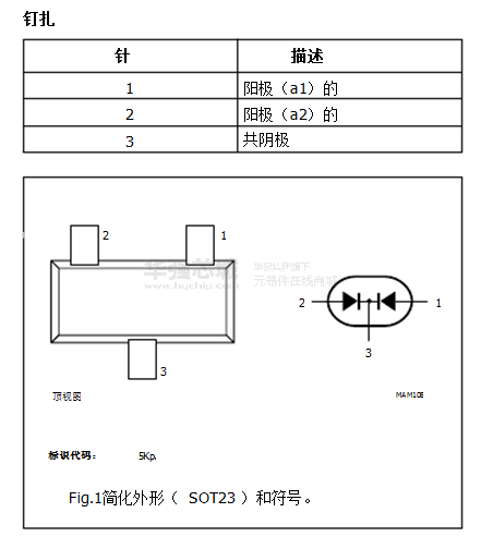 兩個(gè)平面PIN二極管共陰極配置在SOT23小型塑料SMD封裝。