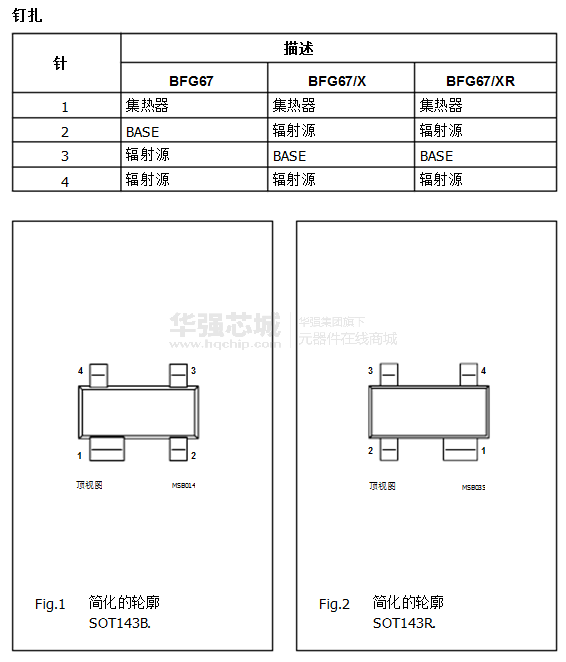 在一個4針型硅NPN晶體管,雙發(fā)射SOT143B塑料封裝??商峁┰诰€發(fā)射釘扎( BFG67 )和交叉發(fā)射釘扎( BFG67 / X) 。版本反向牽制( BFG67 / XR )也可根據要求提供。