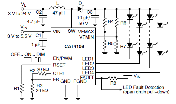 使用安森美半導體制造的CAT4106集成多通道LED驅(qū)動器和高功率DC-DC轉(zhuǎn)換器,可以設(shè)計出非常簡單且高效的LED驅(qū)動器,適用于為總功率高達6瓦的背光應用供電。