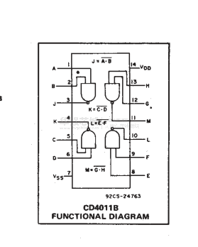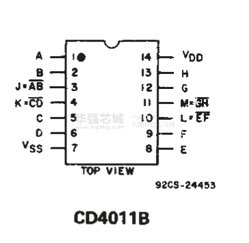 集成電路CD4011是一個包含4個與非門的CMOS電路,每個與非門有2個輸入端一個輸出端。當(dāng)兩輸入端有一個輸入為0,輸出就為0。只有當(dāng)輸入均為1時,輸出才為1。當(dāng)兩個輸入端都為0時,輸出是1。