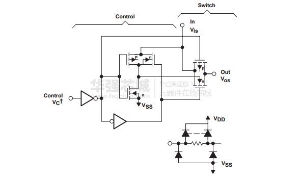 當(dāng)模擬開(kāi)關(guān)的電源電壓采用雙電源時(shí),例如 =﹢5V, =﹣5V(均對(duì)地0V而言),則輸入電壓對(duì)稱于0V的正、負(fù)信號(hào)電壓(﹢5V~﹣5V)均能傳輸。這時(shí)要求控制信號(hào)C=“1”為+5V,C=“0”為-5V,否則只能傳輸正極性的信號(hào)電壓。