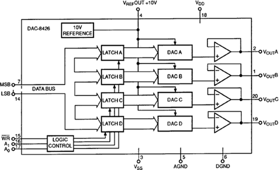 ADI公司擁有先進(jìn)的氧化物、硅門極CMOS工藝,因而可在同一塊芯片上生產(chǎn)DAC-8426的模擬和數(shù)字電路。此外,配合ADI公司高度穩(wěn)定的薄膜R-2R電阻梯形網(wǎng)絡(luò),也有助于DAC之間的匹配和溫度跟蹤。