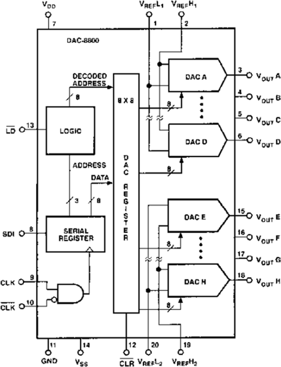 一個三線串行數字接口加載8個內部DAC寄存器中的內容,這些寄存器確立輸出電平。一個異步清零(CLR)輸入引腳將所有DAC置于零代碼輸出狀態(tài),利于系統(tǒng)上電。通過一個內部調節(jié)器來在較寬的VDD電源電壓范圍內提供TTl輸入兼容性。將VSS連至GND可以實現單電源工作模式。