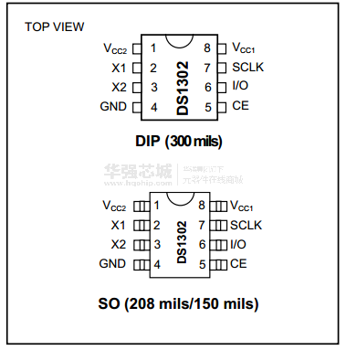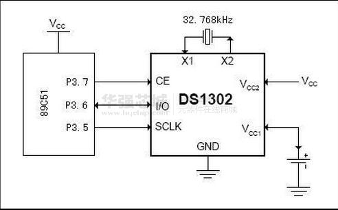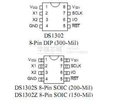 DS1302的引腳排列,其中Vcc1為后備電源,VCC2為主電源。在主電源關(guān)閉的情況下,也能保持時(shí)鐘的連續(xù)運(yùn)行。DS1302由Vcc1或Vcc2兩者中的較大者供電。當(dāng)Vcc2大于Vcc1+0.2V時(shí),Vcc2給DS1302供電。當(dāng)Vcc2小于Vcc1時(shí),DS1302由Vcc1供電。