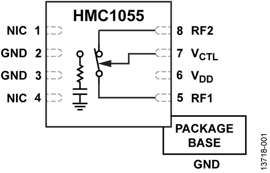 HMC1055在極低直流下采用單正電源電壓和單正控制電壓。 RF1反射斷開(kāi),而RF2在關(guān)斷狀態(tài)下端接至50 Ω。