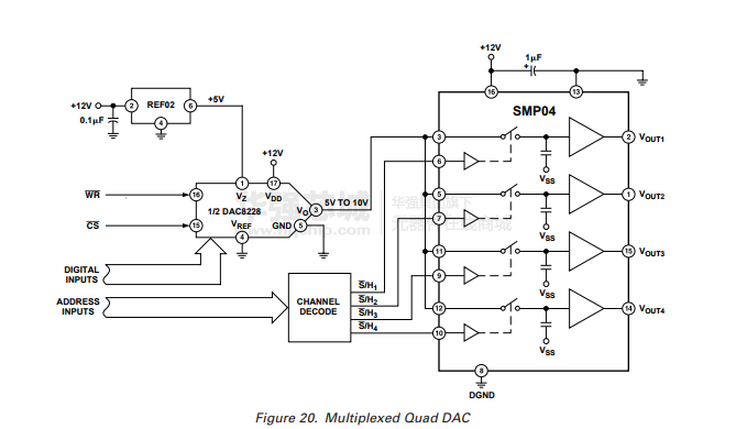 SMP04適用于眾多采樣保持應(yīng)用,包括放大器失調(diào)或VCA增益調(diào)整。可以用一個(gè)或多個(gè)SMP04與單個(gè)或多個(gè)DAC相配合,為系統(tǒng)提供多個(gè)設(shè)置點(diǎn)。