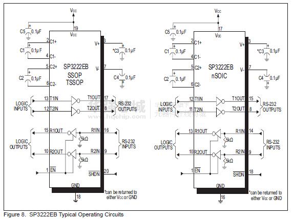 如筆記本電腦或筆記本電腦。的sp3222eb / sp3232eb系列產(chǎn)品具有效率高,電荷泵電源,只需要0.1μμF的電容。