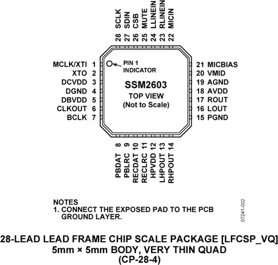 SSM2603的額定溫度范圍為?40°C至+85°C工業(yè)溫度范圍,采用28引腳、5 mm × 5 mm引腳架構(gòu)芯片級(jí)封裝(LFCSP)。